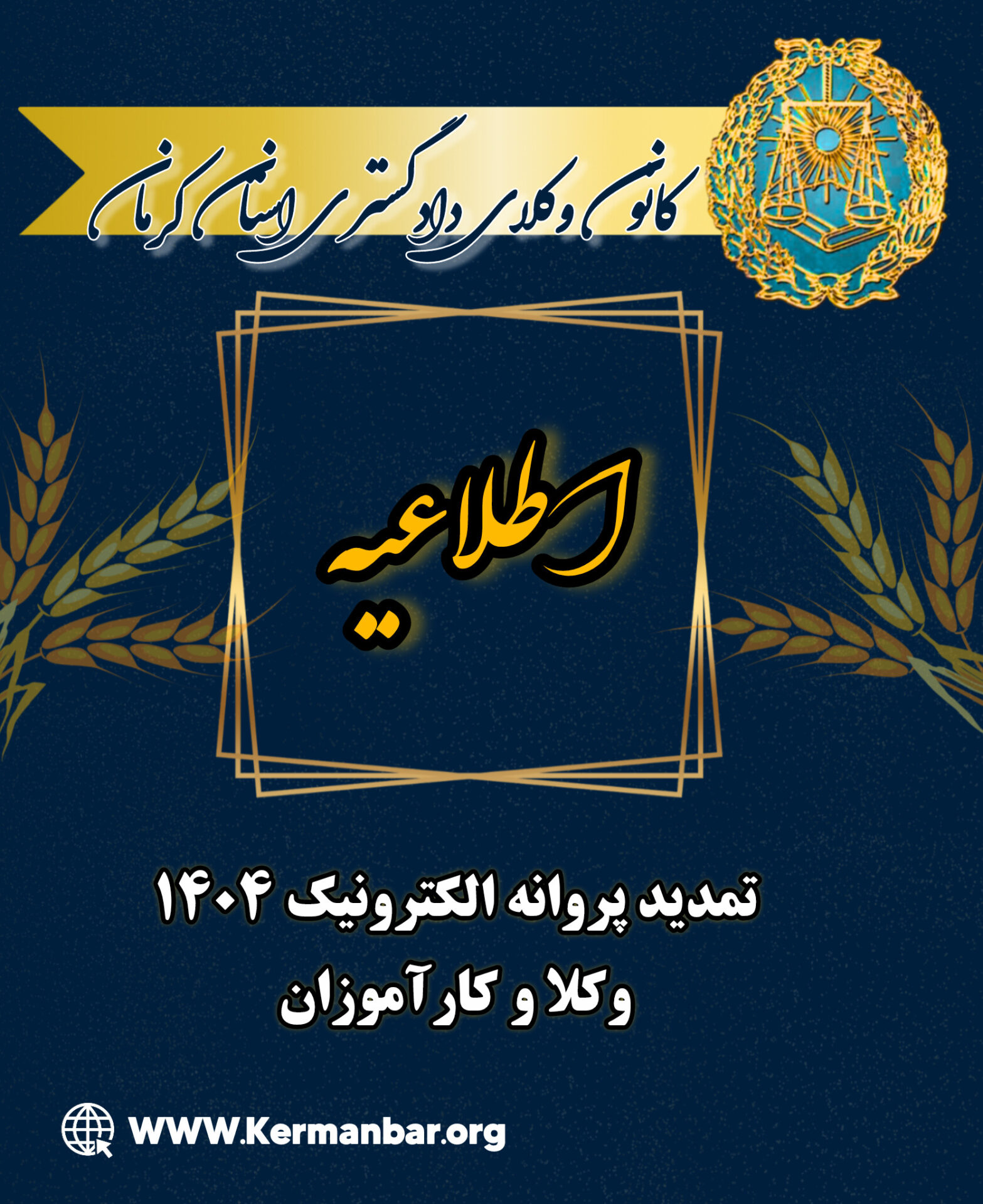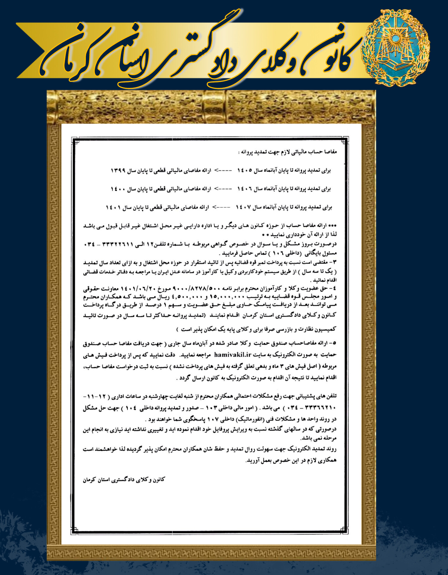 ✅ وکلا و کارآموزان محترم لازم است با مراجعه به سایت www.kermanbar.org و تکمیل مراحل مربوطه، نسبت به تمدید پروانه خود اقدام نمایند .