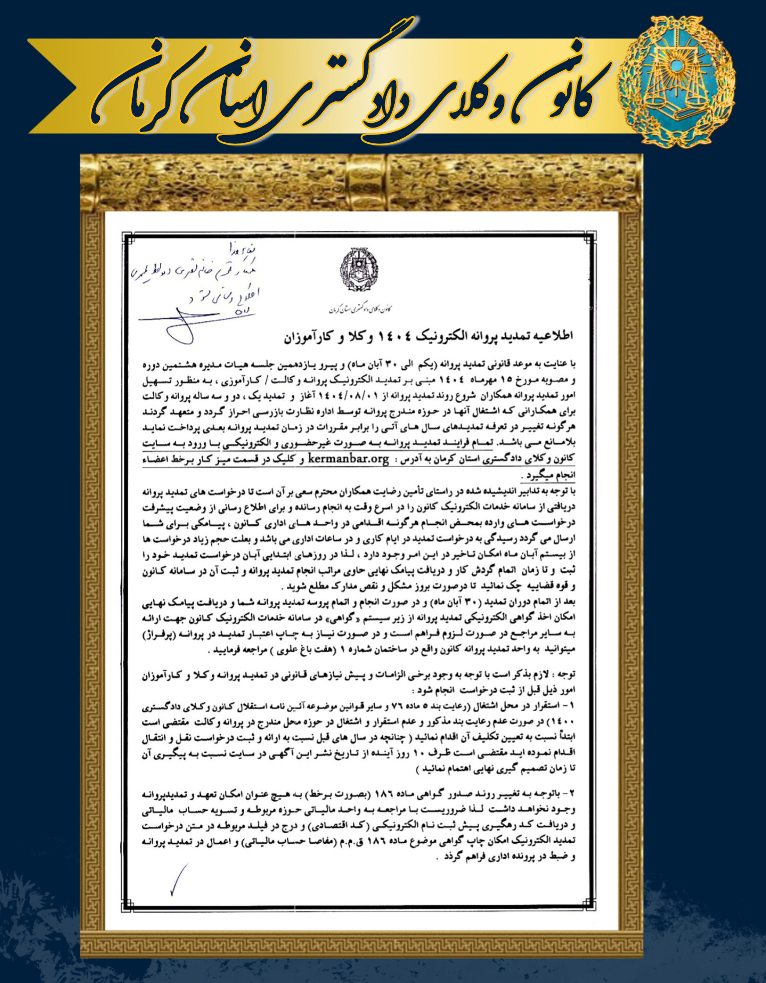 ✅ وکلا و کارآموزان محترم لازم است با مراجعه به سایت www.kermanbar.org و تکمیل مراحل مربوطه، نسبت به تمدید پروانه خود اقدام نمایند .