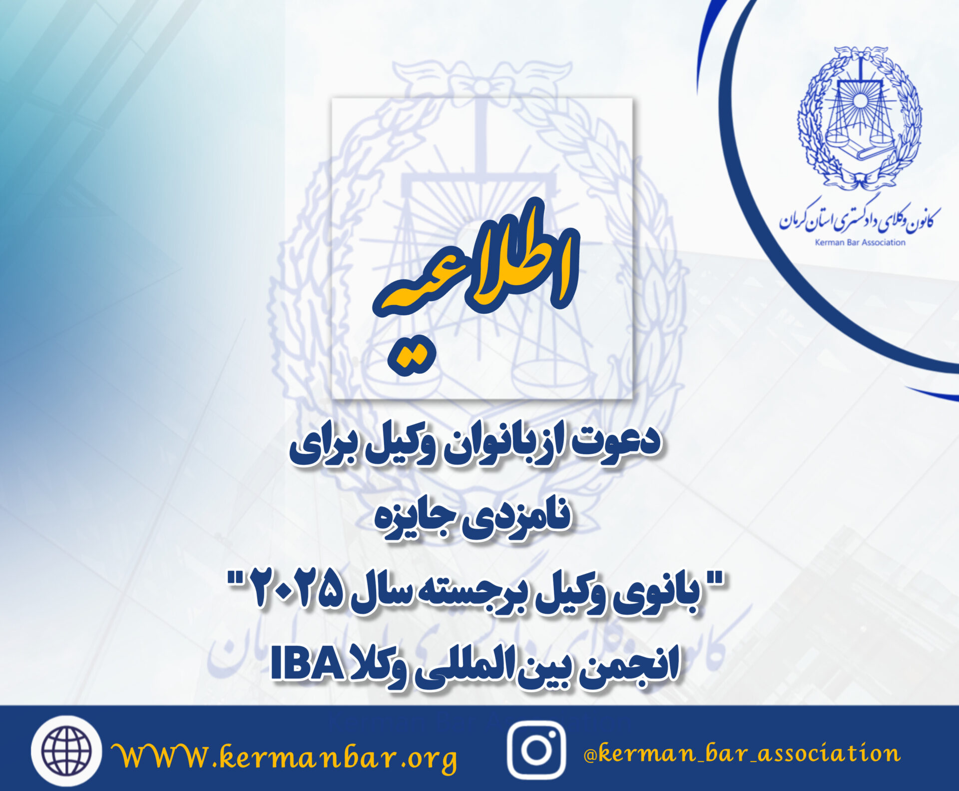 🔹️نظر به اینکه انجمن بین المللی وکلا (IBA) ، که کانون وکلای دادگستری کرمان نیز عضو دائم آن میباشد. با تعیین شاخص های مندرج در پیوست این اطلاعیه قصد دارد نسبت به انتخاب ” بانوی وکیل برجسته سال 2025 ” که در حرفه ی وکالت عملکردی برجسته داشته و در ارتقای جایگاه بانوان در عرصه ی حقوق نقش موثری ایفا نمودند ، اقدام نماید. با ملاحظه و مطالعه شرایط ، در صورت تمایل به شرکت در مسابقه ی موصوف ، رزومه و درخواست خود را به نشانی مندرج در اطلاعیه یا کانون ارسال نمایید.