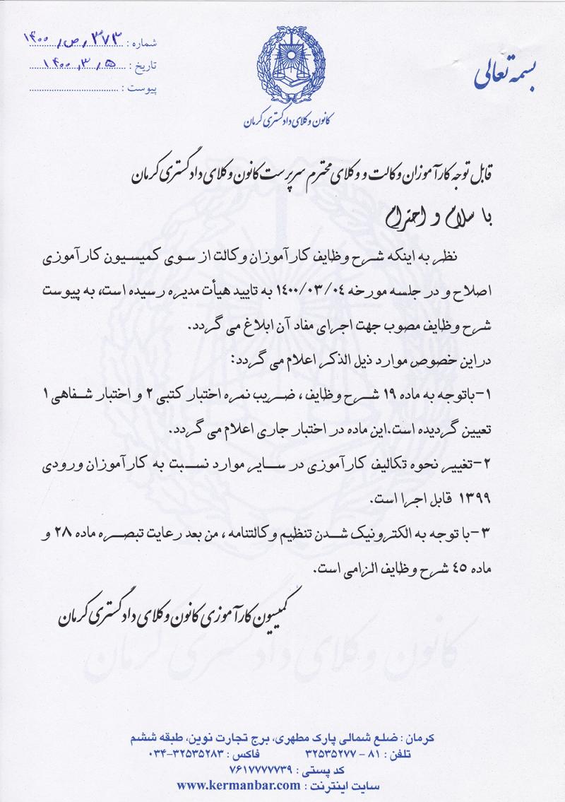 شرح وظايف كارآموزي وكالت دادگستري در 49 ماده تنظیم و در جلسه مورخ 29 اردیبهشت ماه 1400 به تصویب کمیسیون کارآموزی و در جلسه مورخ 1400/03/04 به تصویب هیأت مدیره کانون وکلای دادگستری کرمان رسید.