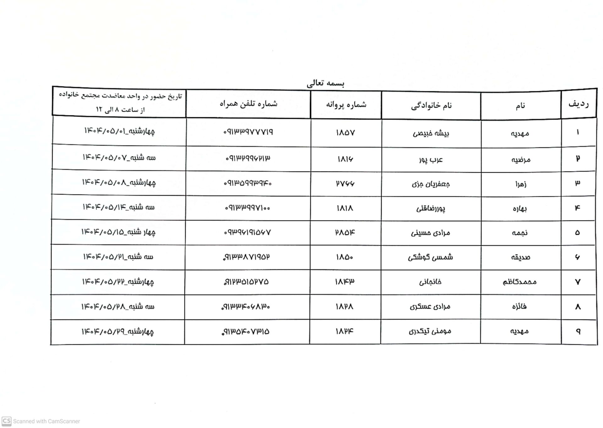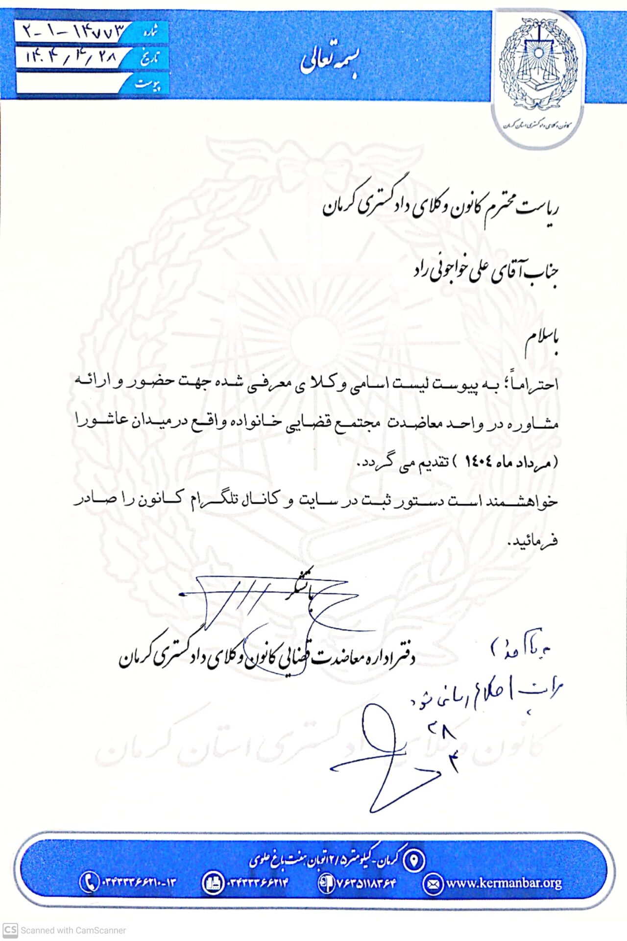 لیست اسامی وکلای محترم معرفی شده  جهت حضور و ارائه مشاوره در واحد معاضدت واقع در مجتمع قضایی خانواده به منظور ارائه معاضدت قضایی_ مرداد ماه ۱۴۰۴