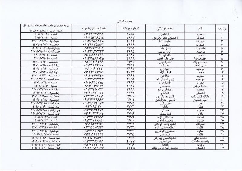 لیست اسامی وکلا و کارآموزان محترم معرفی شده به دادگستری کل استان کرمان جهت ارائه معاضدت قضایی – مهر ماه 1401