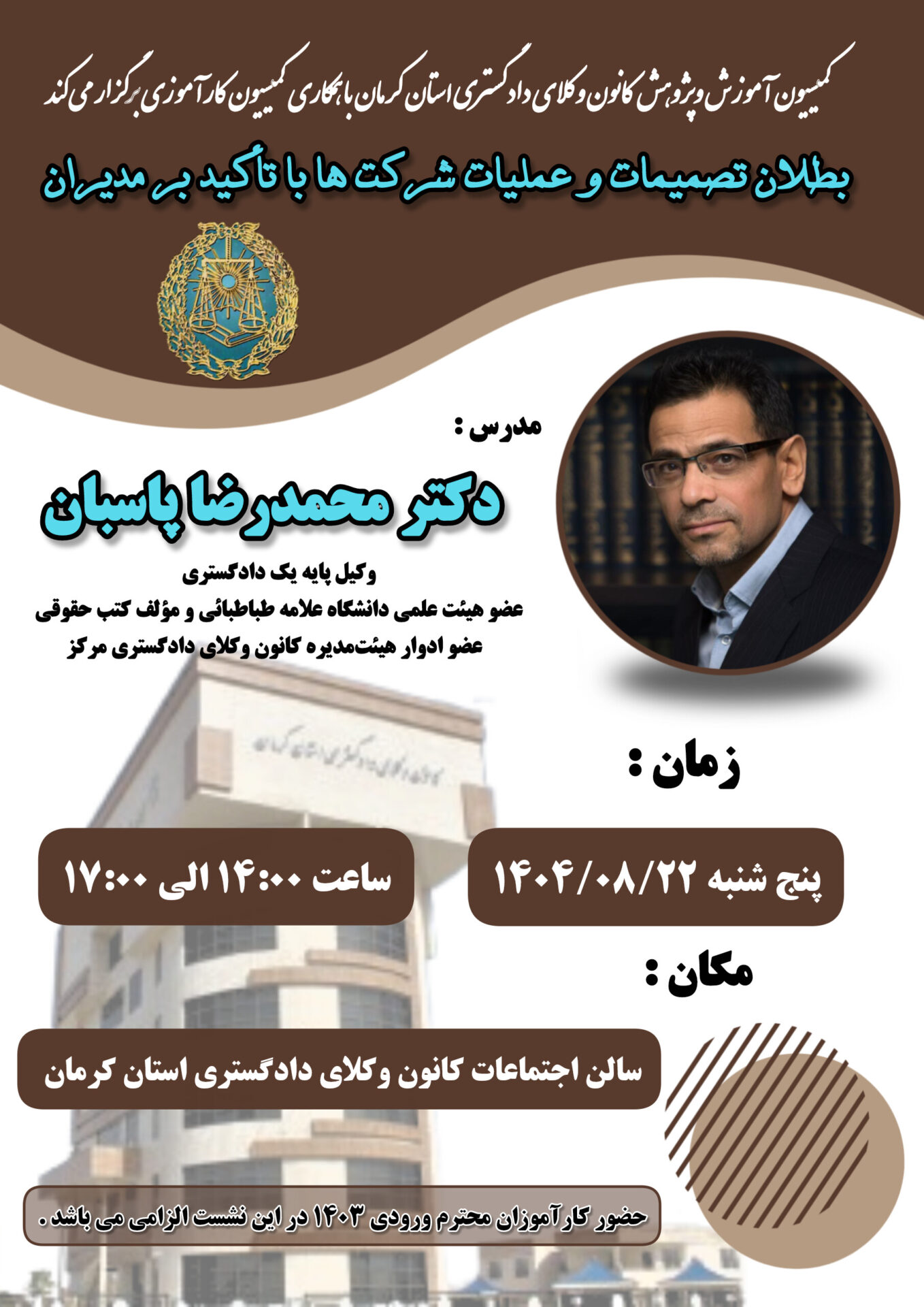 به همت کمیسیون آموزش و پژوهش کانون وکلای دادگستری استان کرمان و همکاری کمیسیون کارآموزی با تدریس استاد بزرگوار دکتر محمدرضا پاسبان